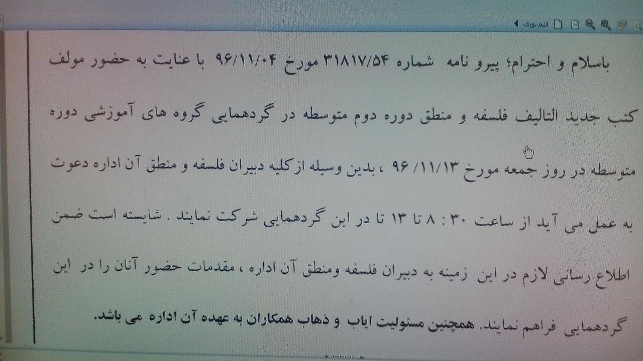 مورخ 18/11/1396 جلسه کارگاه آموزشی فلسفه و منطق با حضور جمعی از همکاران و دبیران دروس فلسفه و منطق در شهرستان تفت به همت گروه فلسفه و منطق استان یزد برگزار شد.